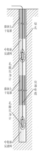 (4)壩基深孔內(nèi)滲壓計的埋設(shè):在壩基深孔內(nèi)埋設(shè)滲壓計時,深孔直徑不小于110mm,孔深達到設(shè)計深度,超深一般不大于10cm。埋設(shè)前測量好孔深,先將儀器裝入能放入孔內(nèi)的砂包中,包中裝細砂,向孔內(nèi)倒入30cm厚的中粗紗,然后將裝有儀器的砂包吊入孔底。如孔太深,砂包及電纜自重超過電纜強度時,可用鋼絲吊住砂包,并把電纜綁在鋼絲上進行吊裝,以免電纜損壞,再在上面填入40cm厚細砂,然后填20cm厚,再在余孔段灌入水泥膨潤土漿或預(yù)縮水泥砂漿。電纜采用PVC軟管保護,用鉛絲與測頭相連。施工過程中隨時進行檢測,一旦發(fā)現(xiàn)儀器與連接電纜有損壞時,及時處理或重新埋設(shè)。